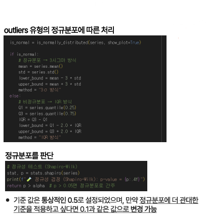 - outliers ์ ํ ๋ด์์๋ ๋ฐ์ดํฐ ๋ถํฌ ๋ฐฉ์์ ๋ฐ๋ผ ๋ค๋ฅด๊ฒ ์ฒ๋ฆฌํจ